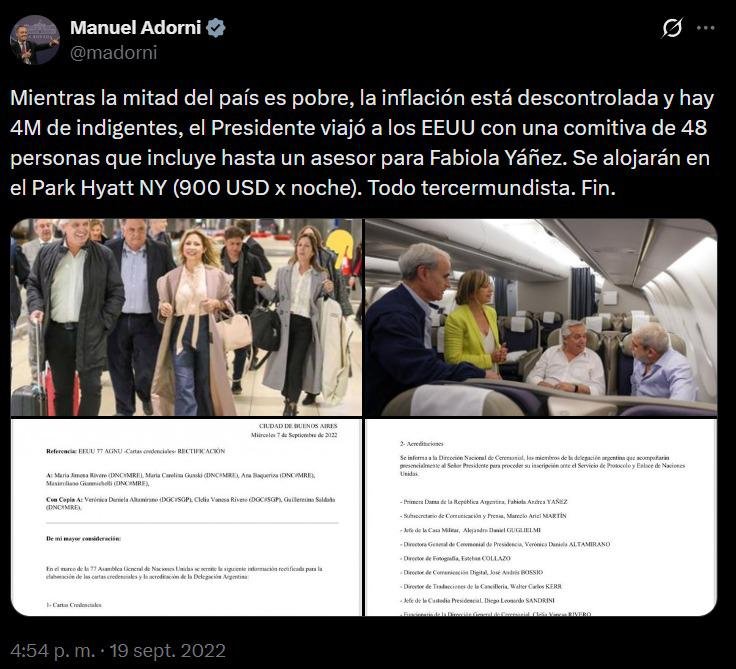 El episodio cobró mayor repercusión cuando usuarios recordaron un mensaje publicado por Adorni el 19 de septiembre de 2022 en su cuenta de la red social X (entonces Twitter). En ese momento, el actual jefe de Gabinete cuestionaba un viaje del entonces presidente Alberto Fernández a Estados Unidos y apuntaba contra el tamaño de la comitiva oficial y los gastos del traslado.